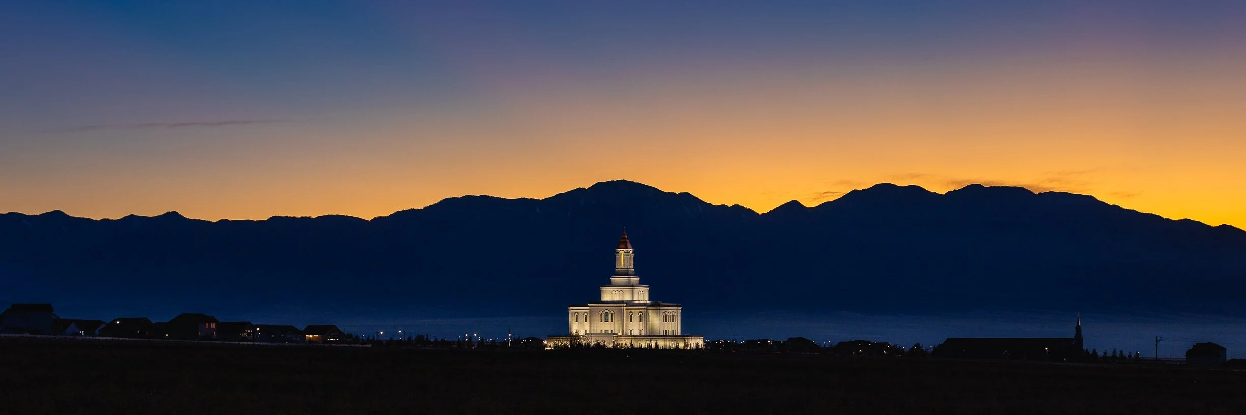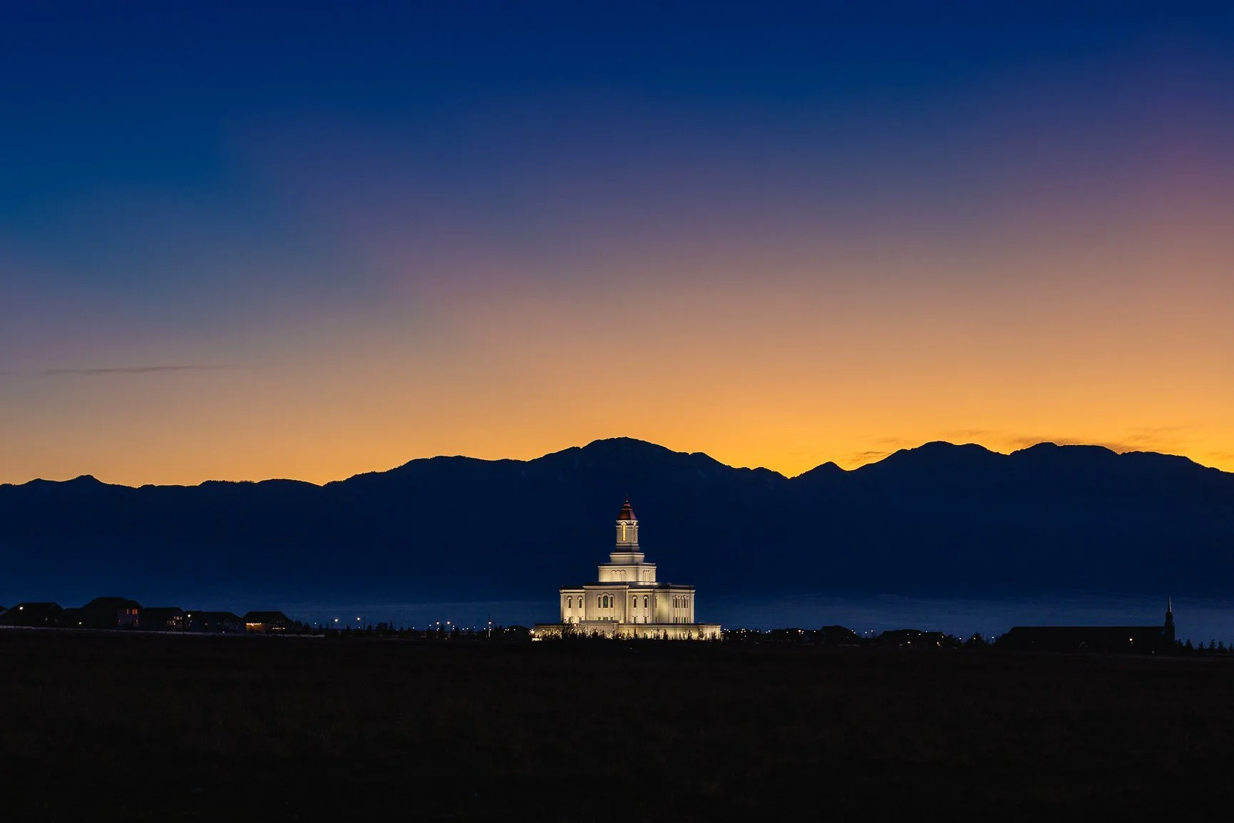 The last glow of sunset as the exterior lights illuminate the Deseret Peak Utah Temple.