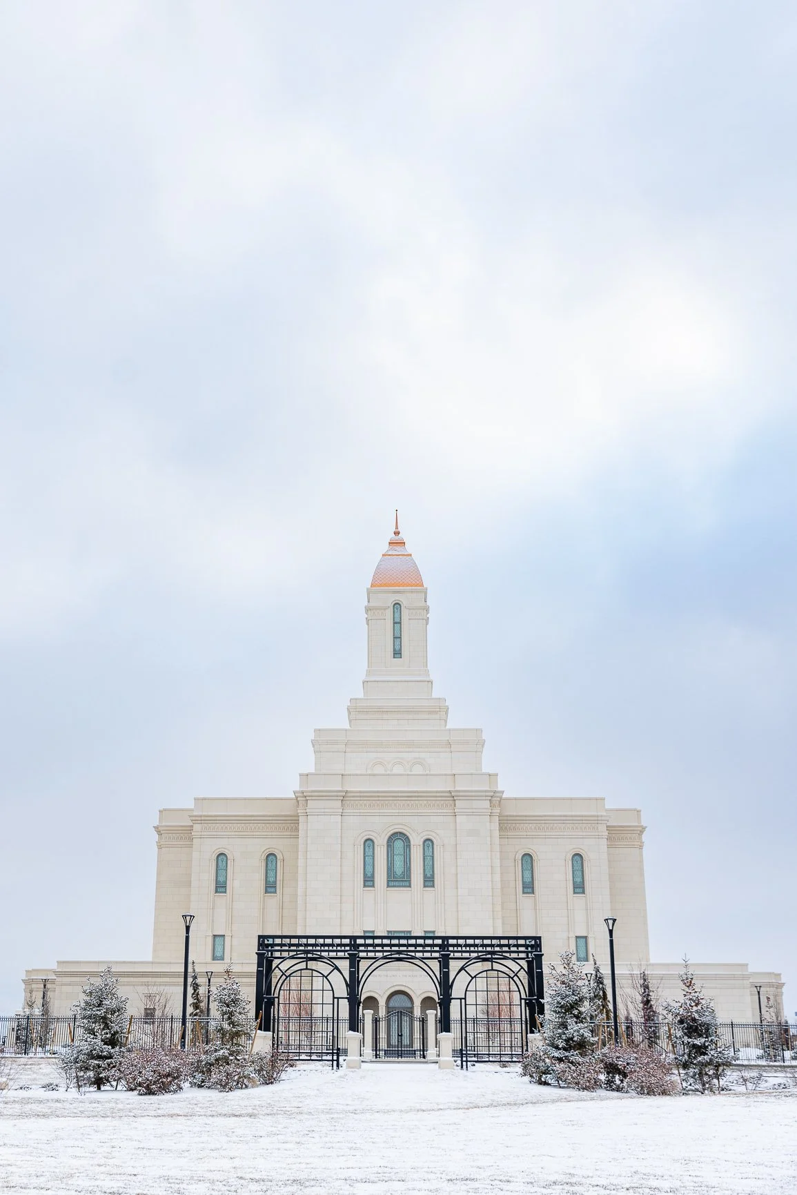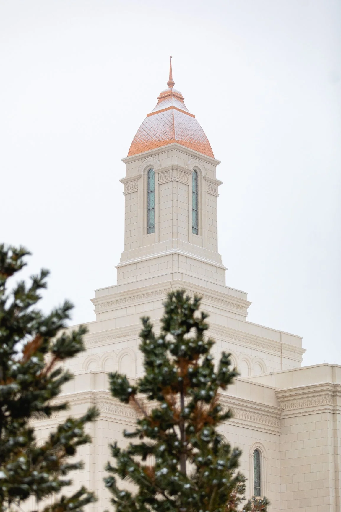 A light dusting of snow tops the copper dome of the Deseret Peak Temple. Evergreens on the temple grounds frame the corner of the image.