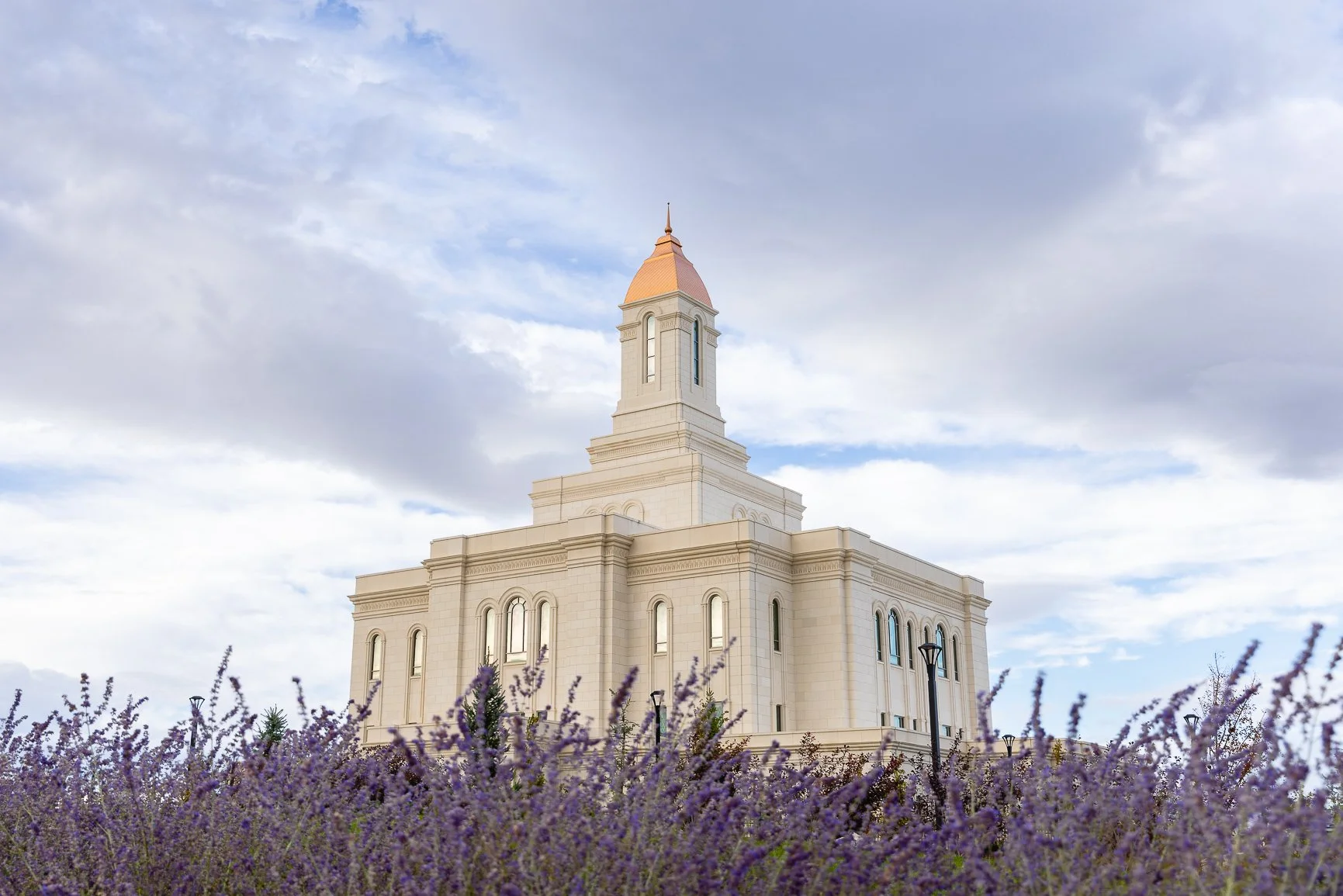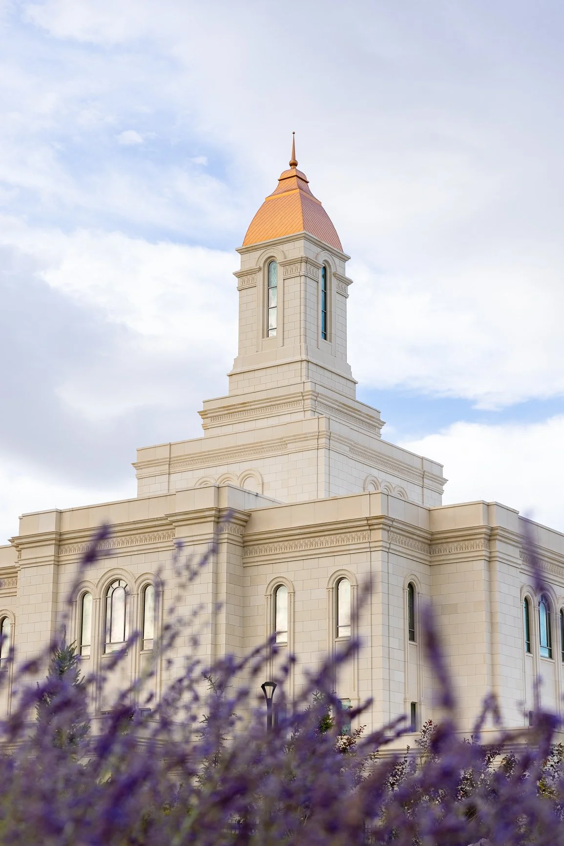 Silvery lupine foregrounds the Deseret Peak Temple, which extensively uses the silvery lupine in its architecture. The violet flowers are offset by the temple’s copper dome.