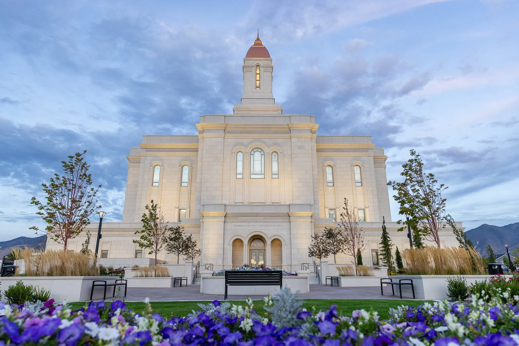 The exterior lights illuminate the temple’s walls just after sunset. A bed of pansies frame the bottom of the image.