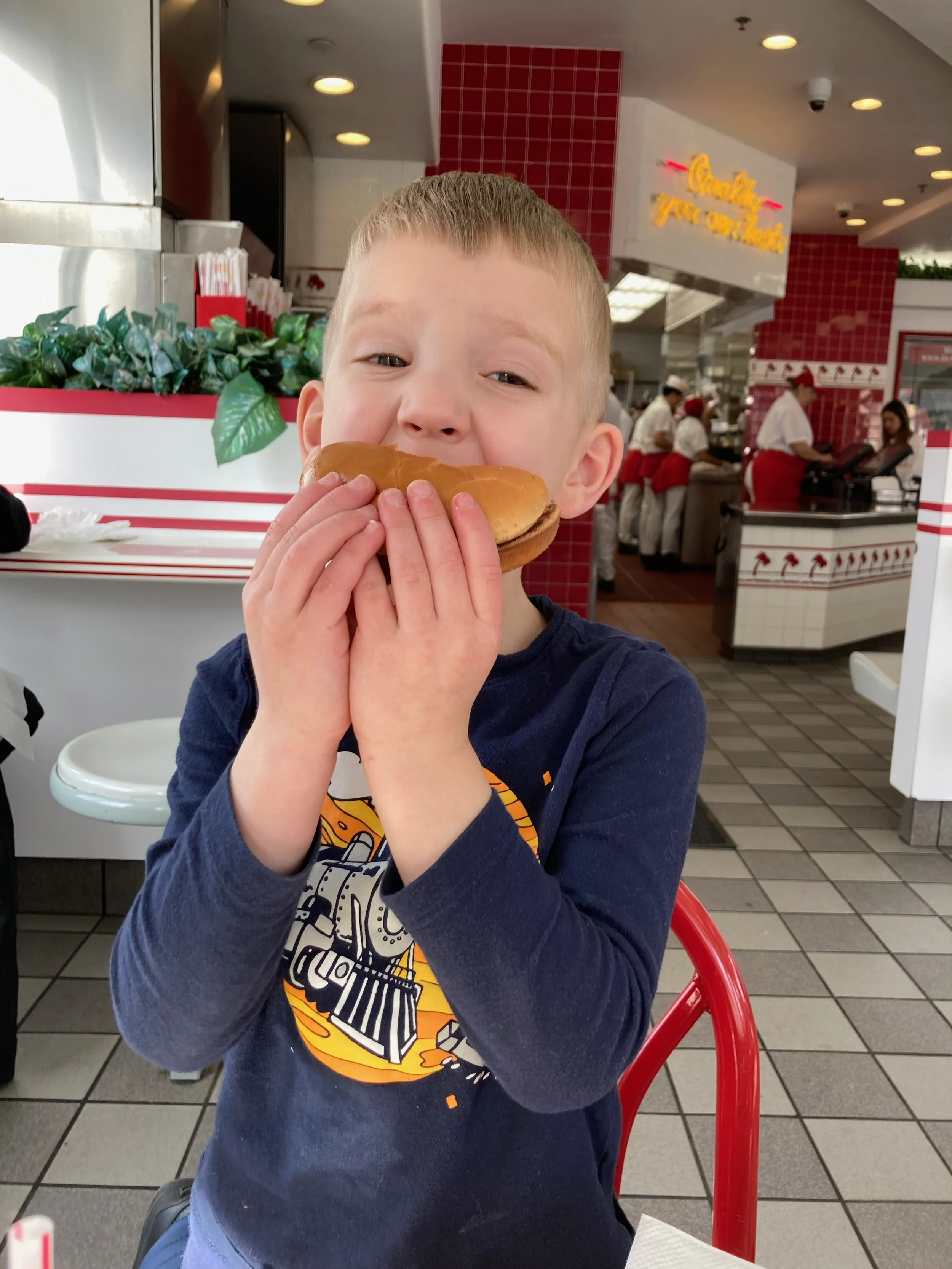 Callum enjoying his cheeseburger at “the bestest place ever”: